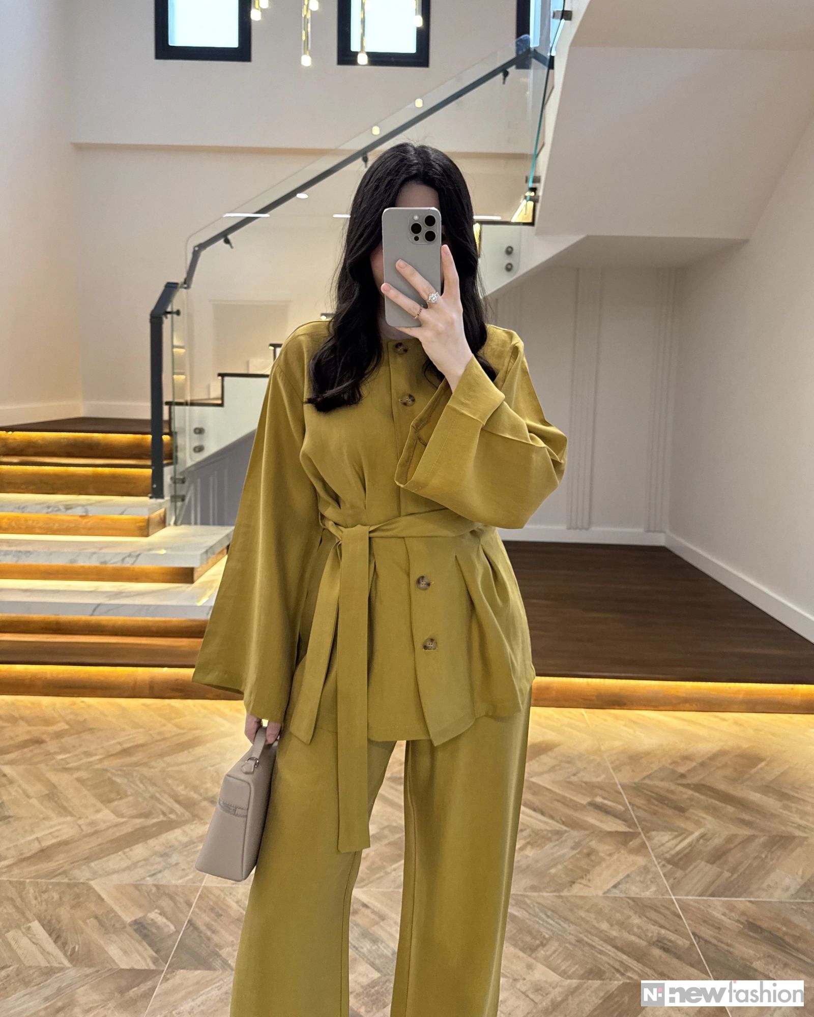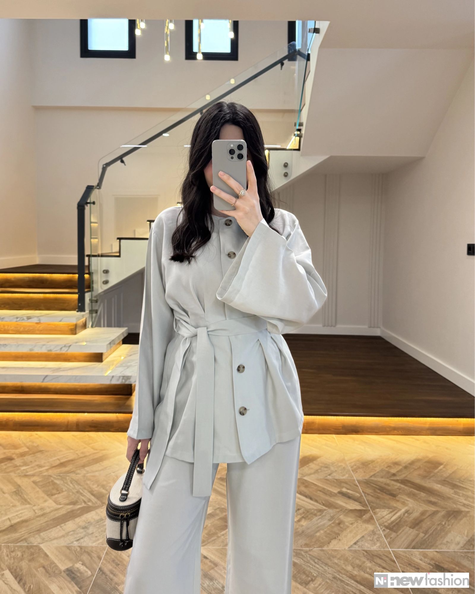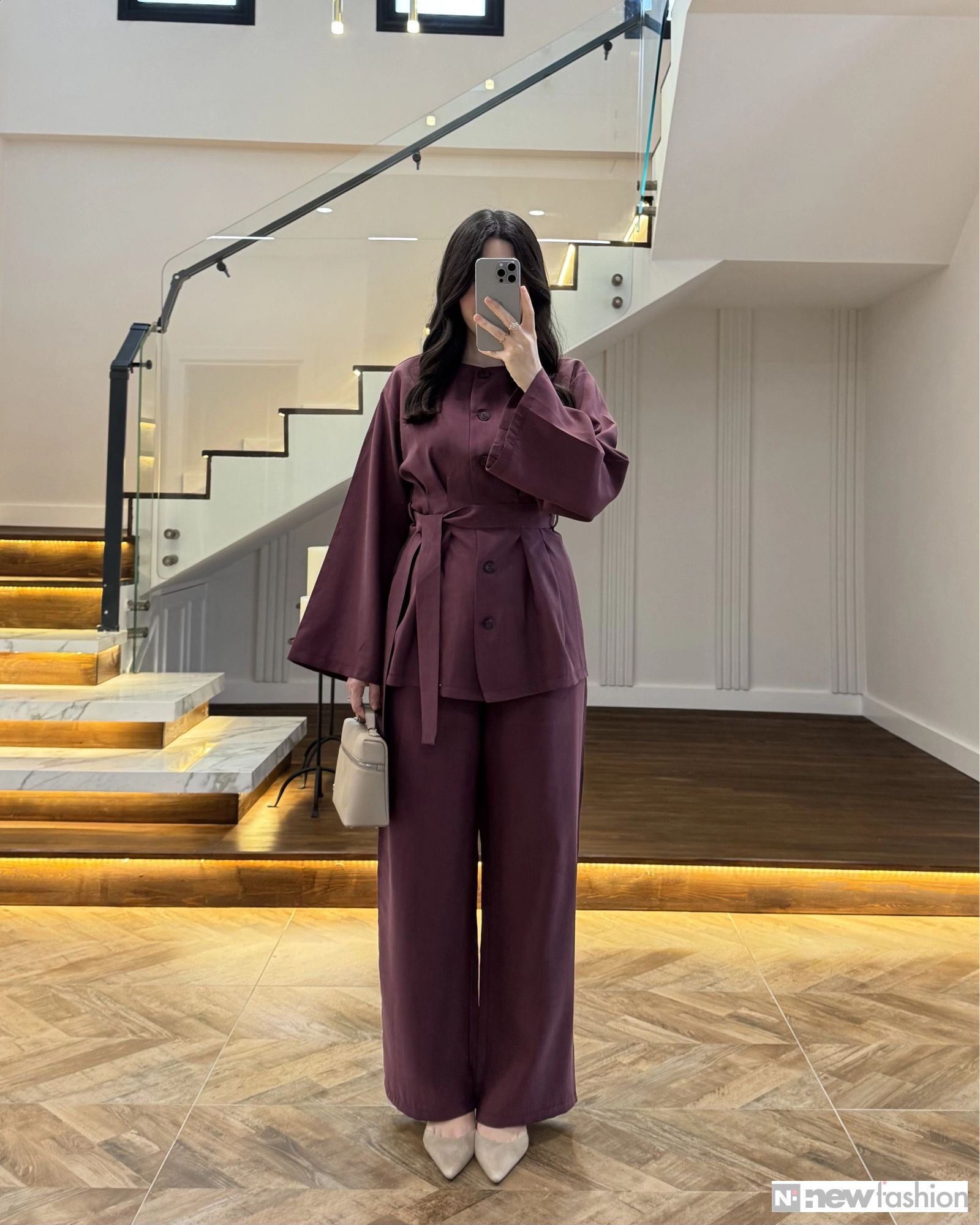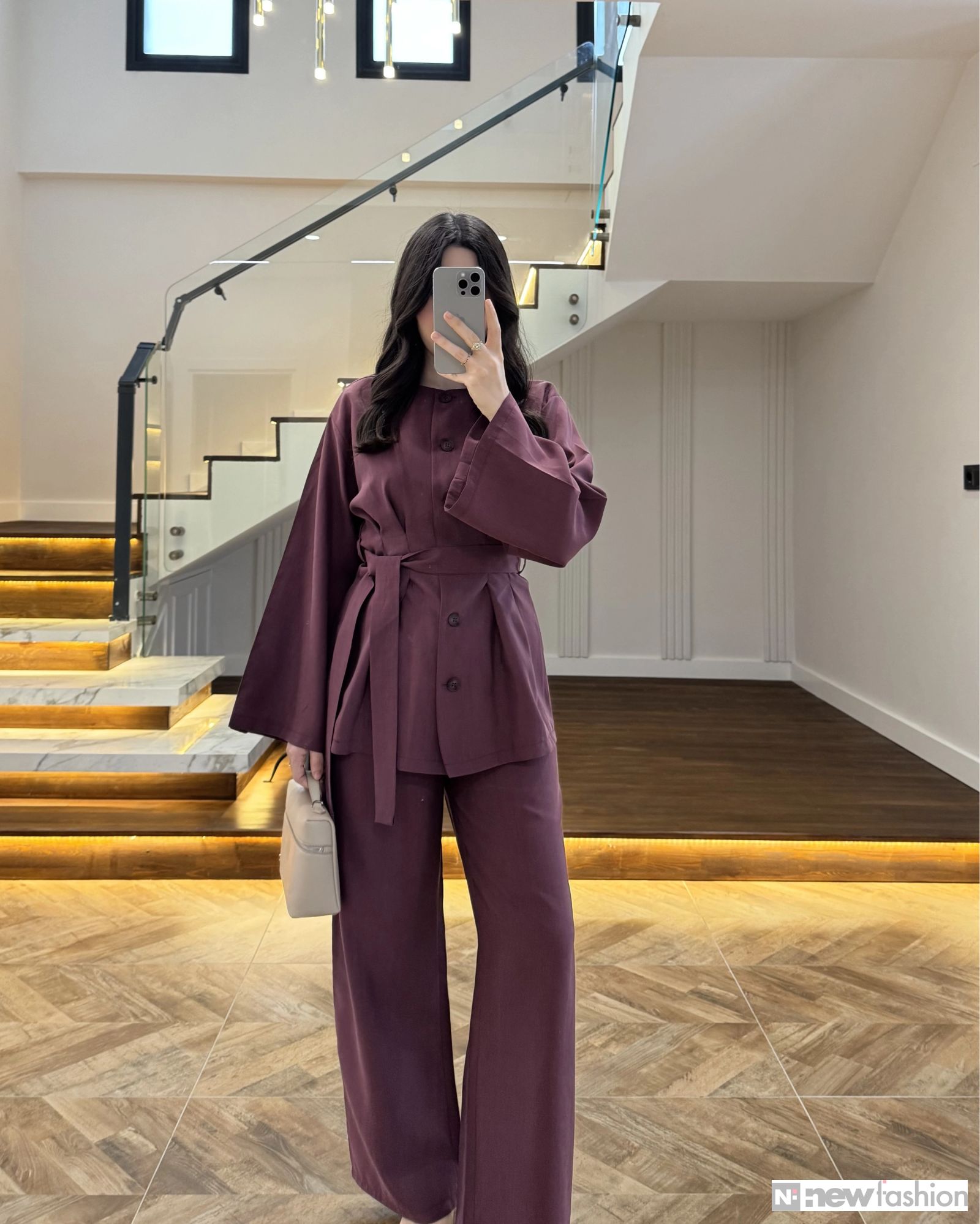 - القطعة العلوية: قميص أنيق مزود بأزرار أمامية عملية، وأكمام واسعة تمنحك حرية الحركة وشعوراً بالراحة، بالإضافة إلى حزام قماشي متناسق يمكن ربطه ليبرز جمال الخصر ويضفي لمسة أنثوية راقية.
